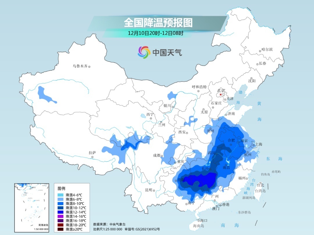 未来,降温将会滚动到江南西部等地,川西高原北部、黄淮南部、江淮、江汉东部、江南中西部、贵州东部、华南北部等地将先后降温6~8℃,其中,安徽西南部、湖北东部、湖南中南部、贵州东部、广西东北部等地部分地区降温10~12℃,局地可达12℃以上。