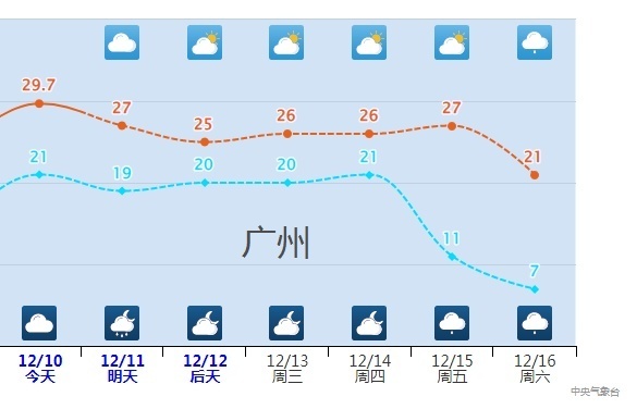 下周的寒潮进程还能影响到广东、广西、福建、海南等地,像广州,14日最低气温还有21℃,16日就降至7℃,必须要翻出厚被子了。